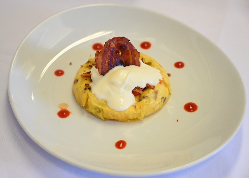 Émile a fait honneur à sa région en préparant une omelette 100 % basque avec du chorizo, de la ventrèche Kintoa, crème d’Ossau Iraty et gelée de piment d’Espelette, accompagnés d’un coulis de piquillos.