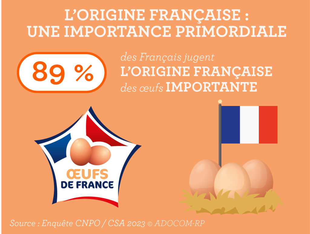 Près de 9 Français sur 10 (89 %) estiment que l’origine française des oeufs est un critère de choix important lorsqu’ils doivent se décider au moment de l’achat.