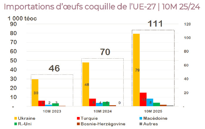 Les oeufs ukrainiens arrivent en effet massivement sur le territoire de l’Union européenne : il s’agit du premier pays fournisseur d’oeufs de l’Europe. Sur 10 mois 2025, les oeufs coquille arrivés d’Ukraine sur le marché de l’Union européenne ont bondi de +59,4 %, après une hausse déjà record de +60 % sur 1 an en 2024. L’Union européenne a ainsi importé 790 000 téoc d’oeufs coquille sur 10 mois 2025, contre 480 000 sur 10 mois 2024.