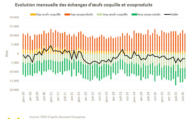 Quant aux ovoproduits, si les exportations sont en hausse de +4,2 % sur 11 mois, les importations augmentent plus rapidement, à +6,7 %.