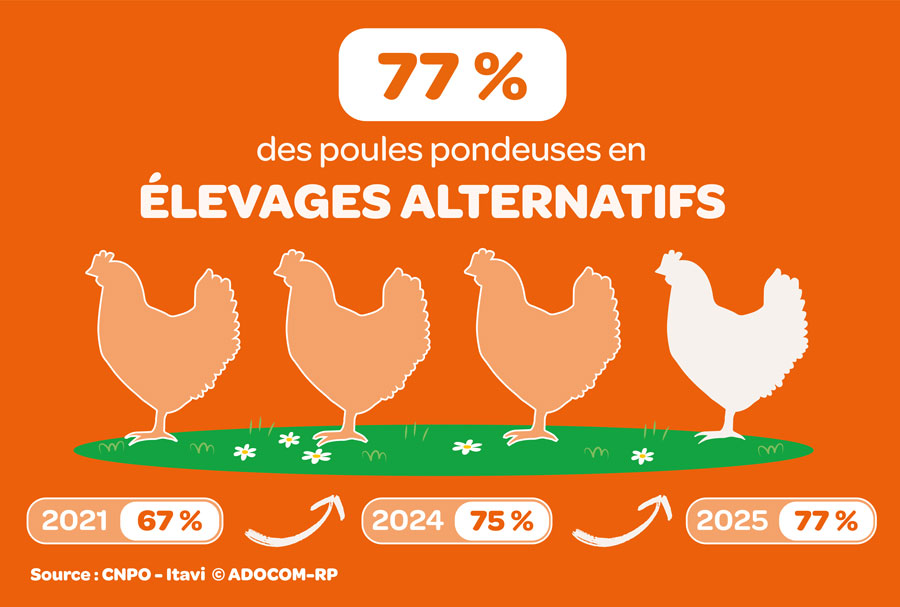 La France poursuit son objectif vers 90 % de poules pondeuses en élevages alternatifs à la cage d’ici 2030. Fin 2025, ils concernaient 77 % des poules : 32 % en plein air (hors Label Rouge), 26 % en élevages au sol, 13 % en bio et 6 % en Label Rouge.