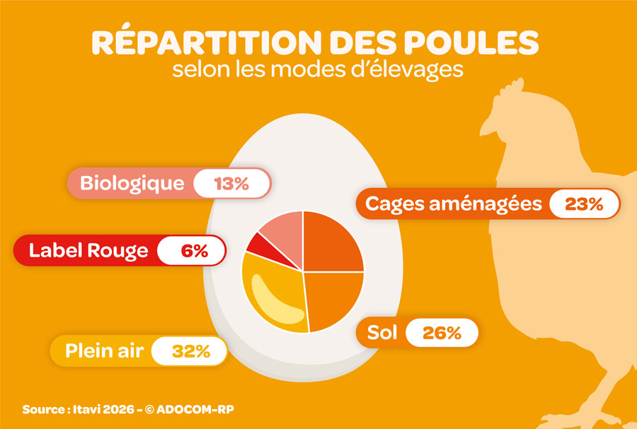 Pour faire face à la hausse de la consommation (+5%), les professionnels se sont notamment mobilisés pour augmenter le nombre de poules mises en place dans les élevages : +3,3 % en 2025 par rapport à 2024. Afin d’accroître la production d’oeufs, ils ont également allongé les durées d’élevage des poules, réduisant le nombre de périodes de vides sanitaires nécessaires entre les lots.