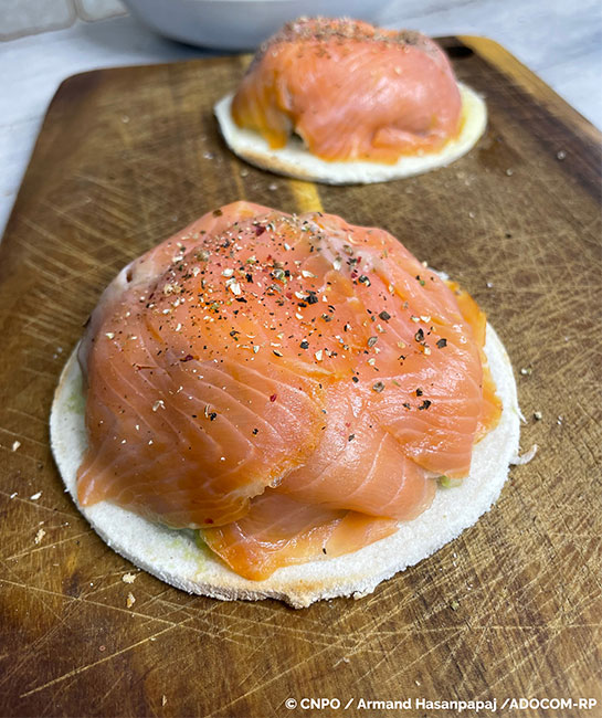 Prendre un récipient et le tapisser de film alimentaire, ajouter le saumon fumé, puis préparer l’œuf poché (le cuire dans une eau vinaigrée pendant 3 minutes.) Une fois l’œuf prêt, le déposer sur le saumon, ajouter les croûtons, le fromage et le guacamole, puis terminer avec le pain rond.