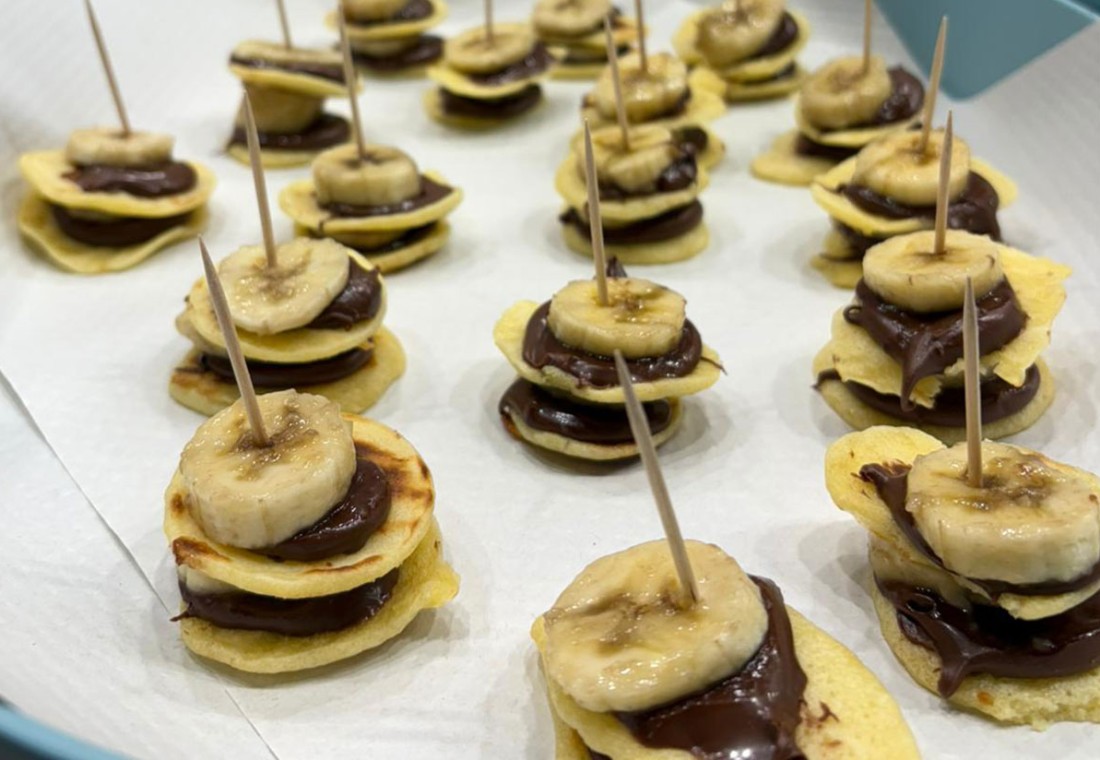 Assembler sur un pic à brochette en bois une rondelle de banane et le sandwich de pancakes. Répéter l’opération.