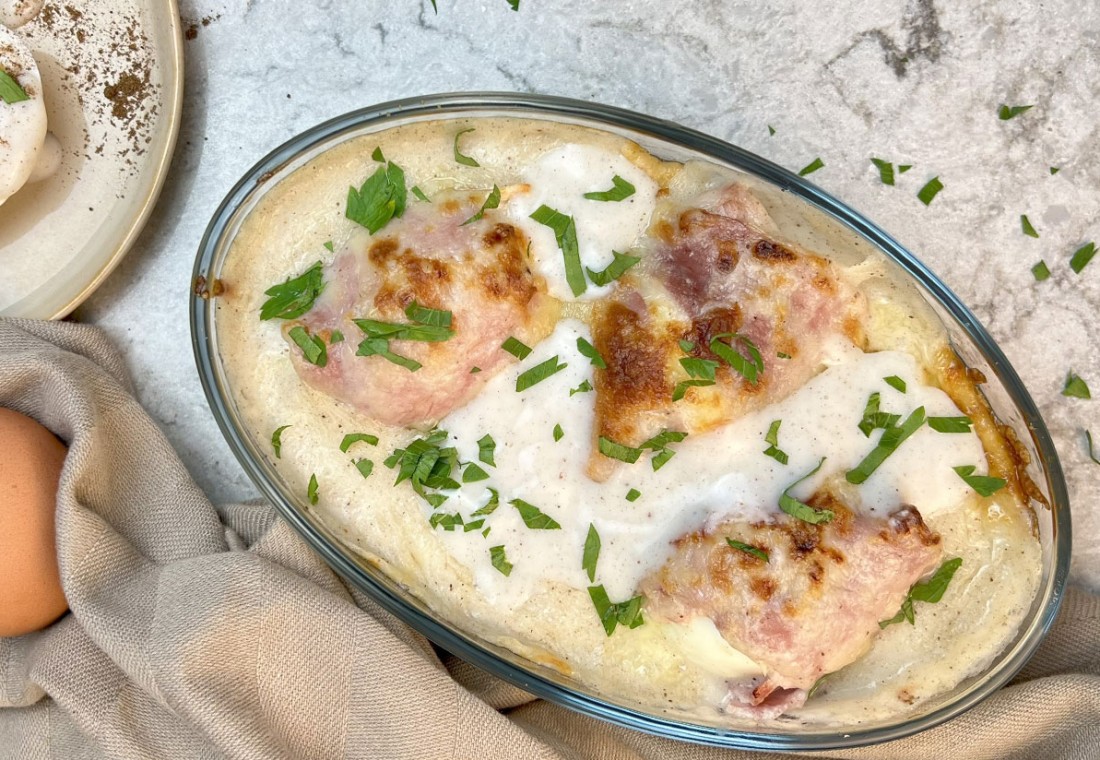Napper généreusement les œufs roulés de sauce béchamel. Saupoudrer le plat de Gruyère et de Parmesan râpés.