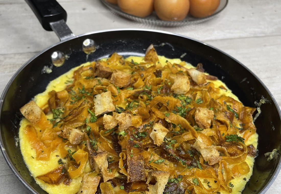 À côté, réaliser une omelette classique : casser trois œufs par personne, assaisonner de sel et de poivre, battre en omelette, puis mettre à cuire dans une poêle avec un peu de beurre moussant.